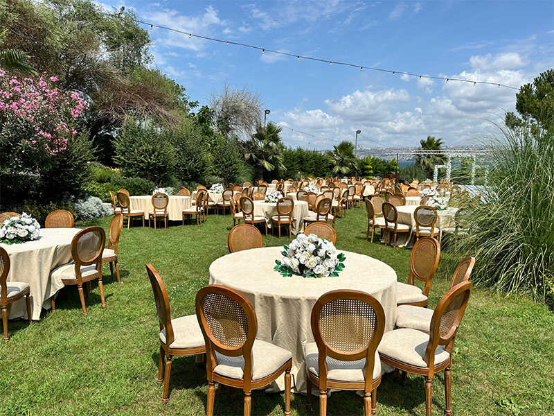 Mavi ve yeşilin uyumuyla boğaz manzarasını aratmayan bir atmosferde, açık hava düğününü kusursuz hale getirdik. Hazeran detaylar, romantik ışıklandırmalar ve müzikle tamamlanan organizasyonumuzda doğa, zarafetle buluştu.